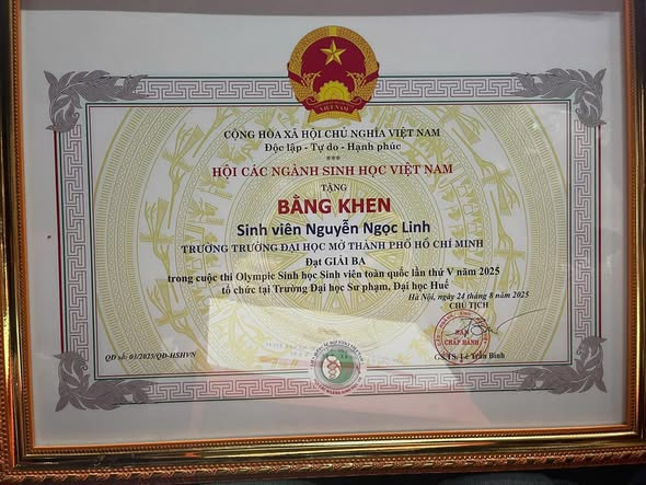 Đặc biệt, xin được gửi lời chúc mừng đặc biệt tới bạn Nguyễn Ngọc Linh đã xuất sắc giành được Giải Ba của cuộc thi. Đây là một thành tích vô cùng xứng đáng, minh chứng cho tài năng, sự chăm chỉ và niềm đam mê không ngừng nghỉ của bạn với sinh học. Chúc mừng đội tuyển đã đạt thành tích xuất sắc trong cuộc thi Olympic Sinh học Toàn quốc lần thứ V, mang vinh quang về cho khoa và trường đại học Mở Tp HCM.